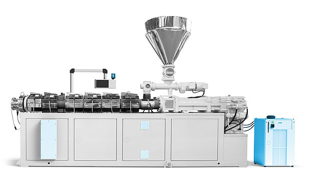 In extrusion, plastically deformable to viscous masses are continuously pressed out of a shaping opening under pressure. The resulting rather elongated two-dimensional “extrudate” then hardens by cooling or chemical reaction. In the plastics industry, materials such as PVC, PE, PP, PUR, etc. are extruded for a wide variety of applications, e.g. into pipes, films, profiles, sheets, sheathing, seals.
