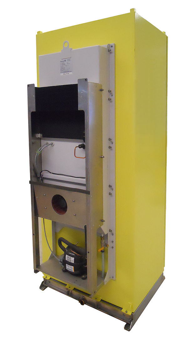 It was possible to meet these requirements, thanks to the mechanical unit construction (figure 3: Swibox electrical enclosure with Pfannenberg DTGT cooling units without top cover) developed especially in cooperation with the company Swibox. This construction ensures a leak-proof separation of the surrounding (outer wall of the unit) and the inside of the electrical enclosure (unit inside), also under pressure load. A special feature here is the developed pressure body inside which the components of the inner cooling circuit are housed. Therefore, it was not enough to use reinforced sheet metal: the selection of a suitable material and the increased material thickness in combination with specially installed stiffening plates led to the desired compressive strength.