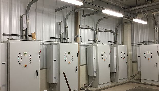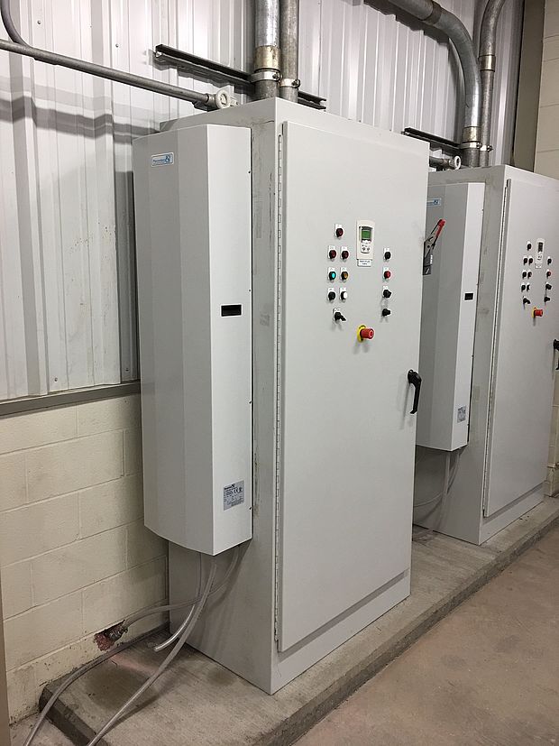 Pfannenberg air-to-water heat exchangers in the pump control room of a wastewater treatment plant.